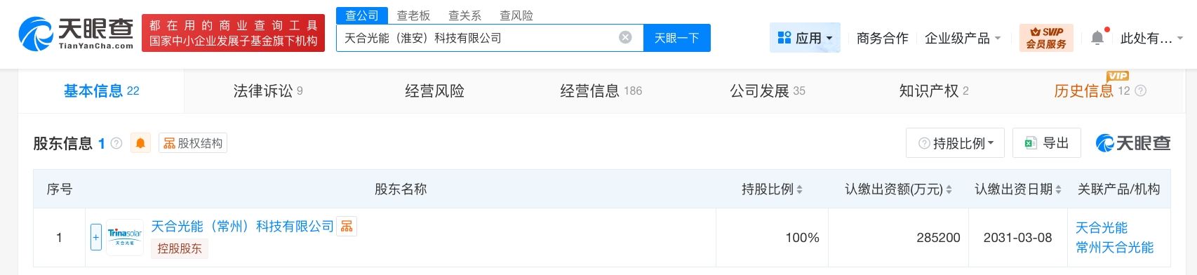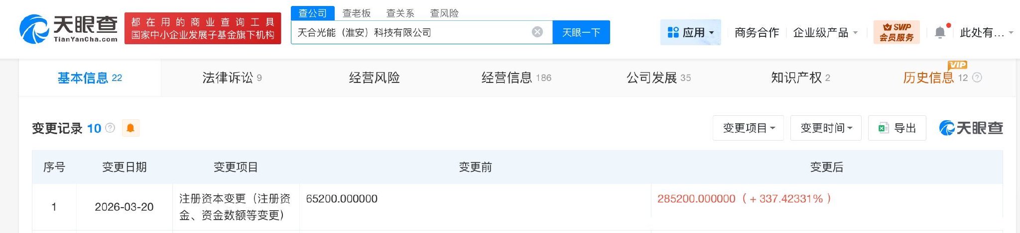 天眼查工商信息显示,近日,天合光能(淮安)科技有限公司发生工商变更,注册资本由约6.5亿人民币增至约28.5亿人民币,增幅约337%。