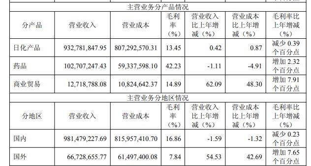 两面针《2025年年度报告》截图,下同。分产品看,2025年日化产品营业收入9.33亿元,同比增长0.42%;药品营业收入1.03亿元,同比下降1.11%;商业贸易营业收入1271.88万元,同比增长62.09%。