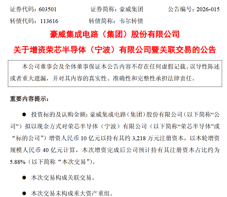 3月20日晚间,豪威集团发布公告,公司拟以现金方式对荣芯半导体(宁波)有限公司增资10亿元,持有其约3218万元注册资本。以本轮增资总规模40亿元计算,本次增资完成后,豪威集团预计持有荣芯半导体注册资本占比约为5.88%。此次投资旨在进一步完善公司半导体产业链布局,通过与上游供应链环节的战略协同,打造更具韧性的供应链网络和交付保障体系。