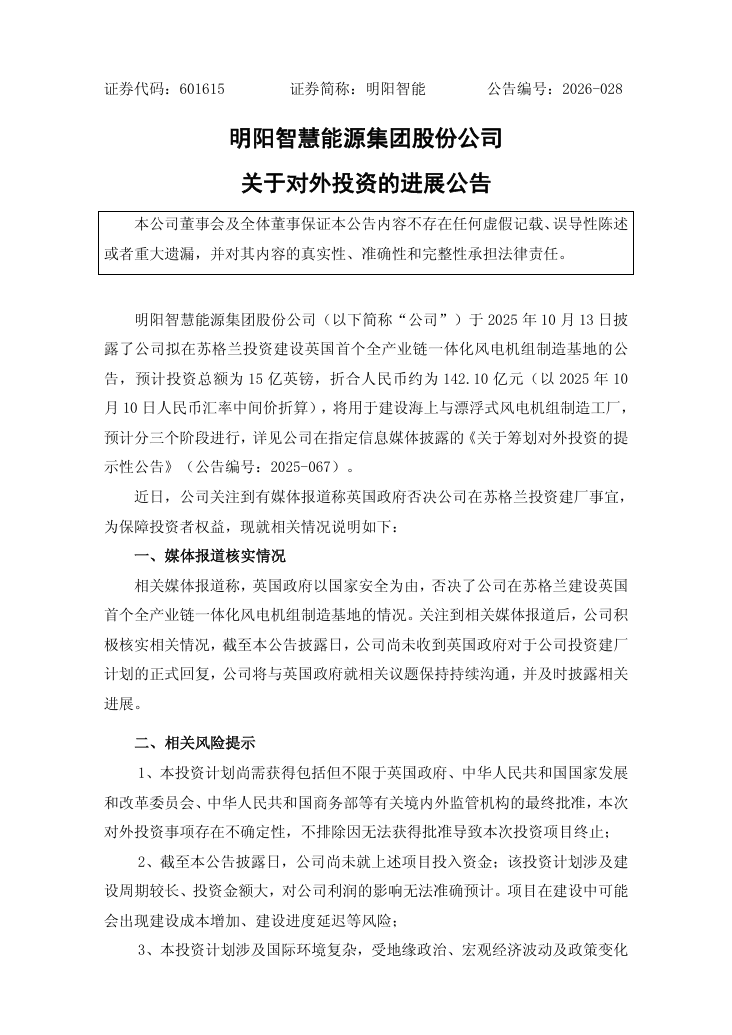 公告披露,近日,明阳智能关注到有媒体报道称英国政府否决公司在苏格兰投资建厂事宜,为保障投资者权益,现就相关情况说明如下: