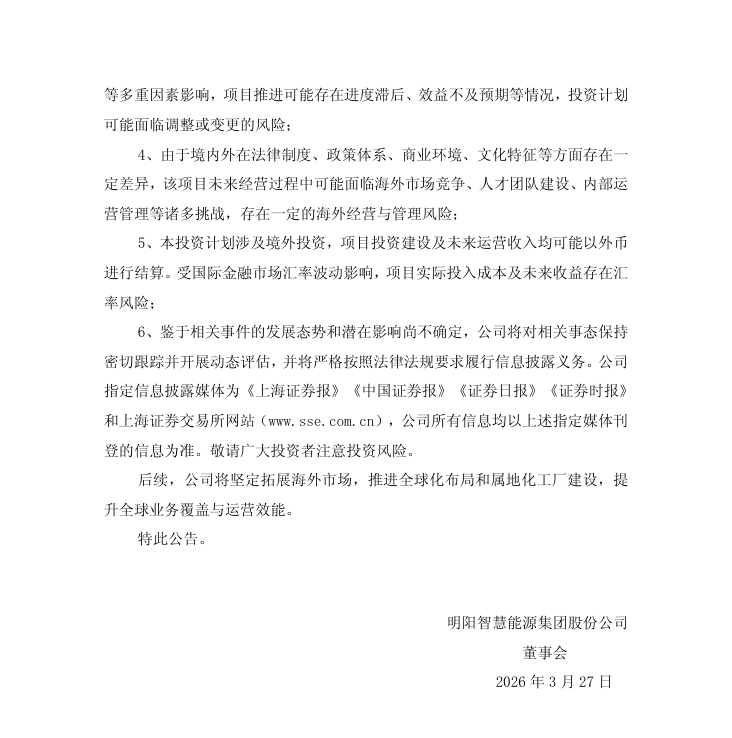 3月27日,明阳智慧能源集团股份公司(以下简称“明阳智能”或“公司”)发布《关于对外投资的进展公告》。