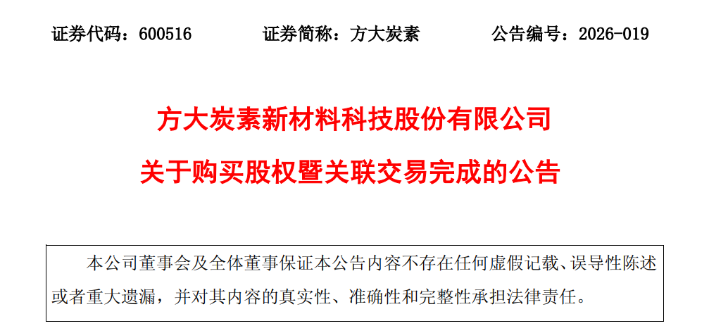 3月26日,方大集团旗下方大炭素新材料科技股份有限公司发布公告称,公司于2026年2月9日召开董事会,审议通过了使用自有资金收购天津一商集团有限公司持有的天津通达环宇物流有限公司100%股权的议案,交易对价为3.19亿元。本次交易完成后,方大炭素将持有通达环宇100%股权。截至公告披露日,公司已按约定完成工商变更登记手续并支付全部款项。