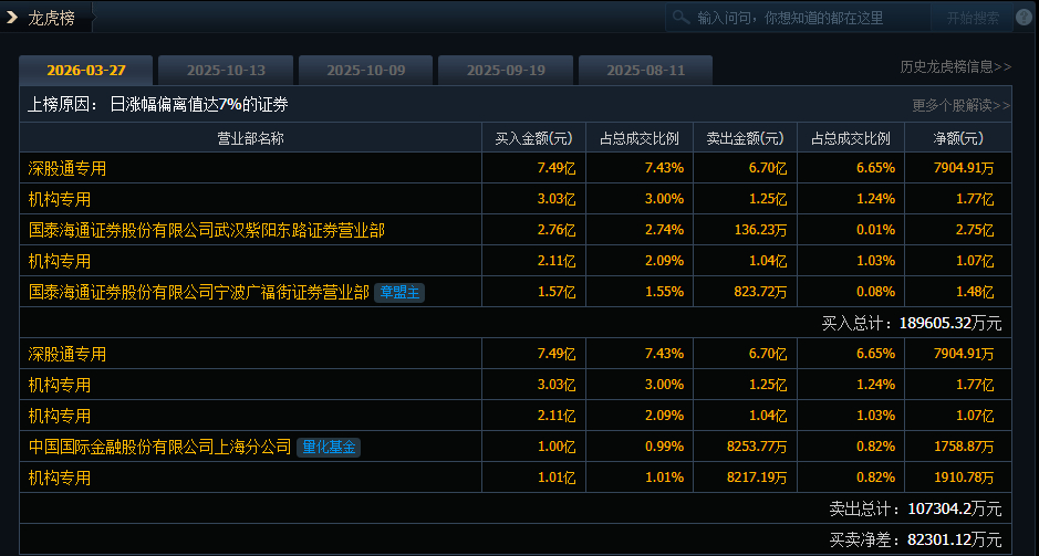 赣锋锂业(002460)今日涨停,成交额100.74亿元,换手率10.83%,盘后龙虎榜数据显示,深股通专用席位买入7.49亿元并卖出6.70亿元,3家机构专用席位净买入3.03亿元。国泰海通宁波广福街(章盟主)净买入1.48亿元。