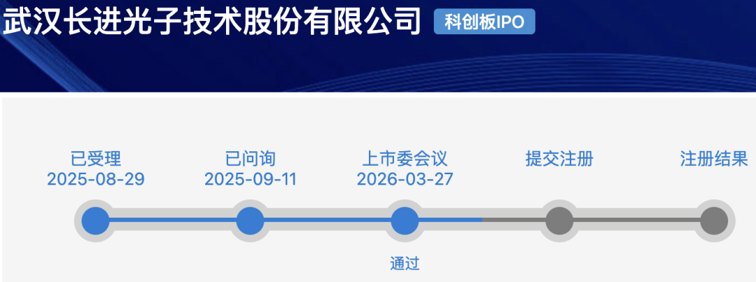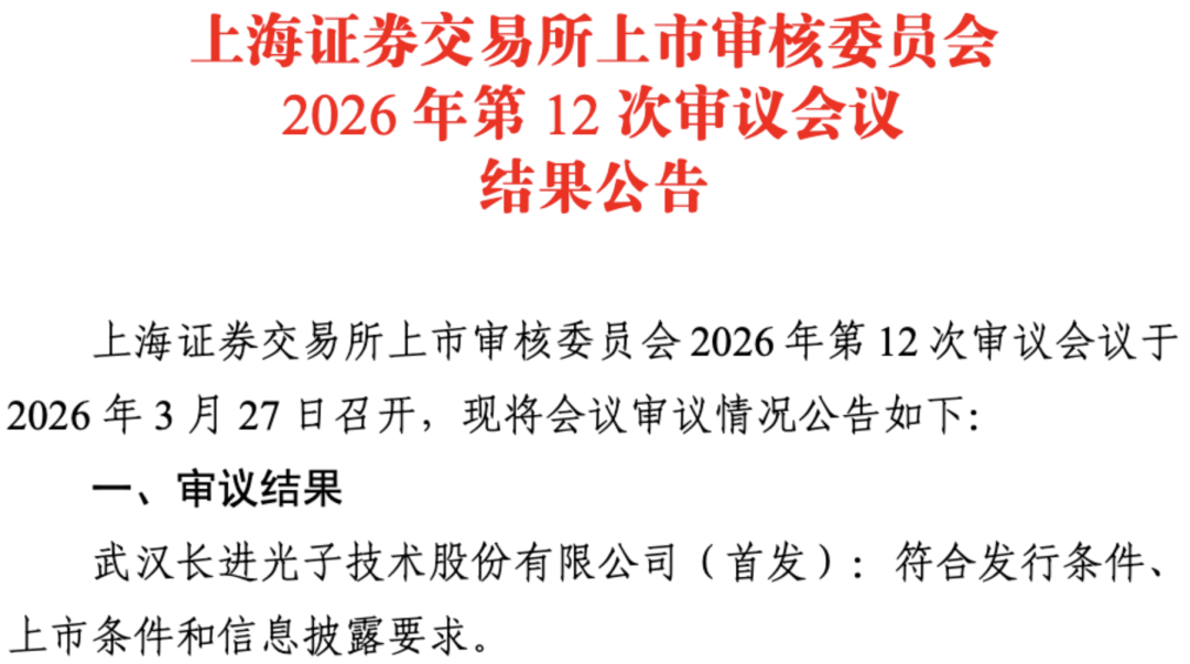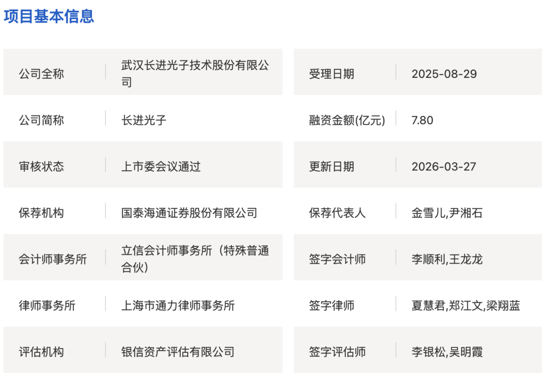 2026年3月27日,上交所官网显示,武汉长进光子技术股份有限公司(简称“长进光子”)科创板IPO项目获得上市委审议通过。