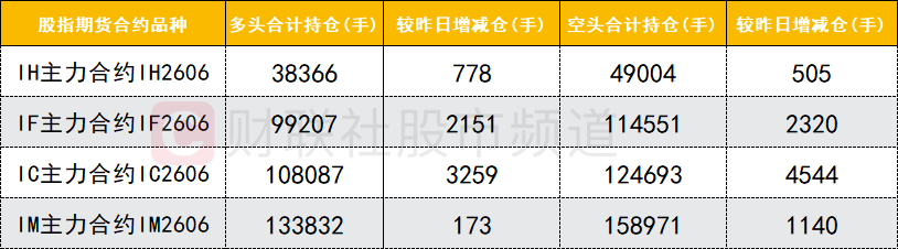 四大期指主力合约中,IH、IF、IC、IM合约多空双方均加仓,IC、IM合约空头加仓数量较多。