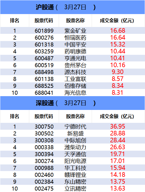 从沪股通前十大成交个股来看,紫金矿业位居首位;恒瑞医药和中国平安分居二、三位。