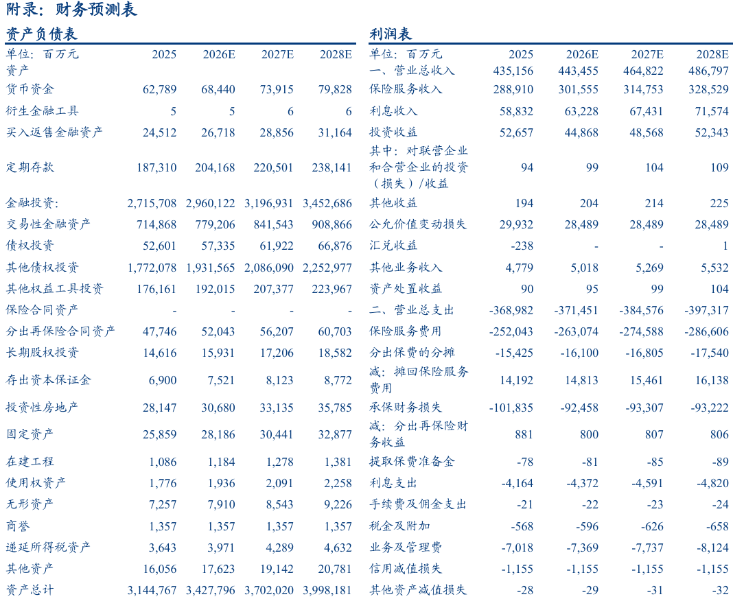 量、价共振,NBV增速亮眼。2025年太保人寿实现NBV同比+40.1%至186亿元,其中新业务价值率同比+3.2pct至19.8%,预计主要受益于预定利率调整和个险报行合一,新保业务合计同比+14.3%至913亿元。