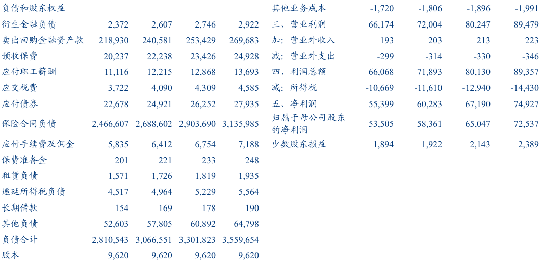 积极增配权益,或逆势布局红利。截至2025年底,集团投资资产3.04万亿, 管理第三方资产8510亿元,分别较上年末+11.2%/+5.3%。配置结构上,投资资产中债券占比61%,同比+0.9pct;股票与权益型基金合计13.4%,同比+2.2pct。其中股票中FVOCI占比37%,同比+7cpt,或反映公司逆势布局红利资产,夯实稳定收益。利率中枢下行影响净投资收益率,权益投资缓解即期利率上行带来的债券浮亏压力,2025年集团实现净/总/综合投资收益率 3.4%/5.7%/6.1%,分别同比-0.4pct/+0.1pct/+0.1pct。
