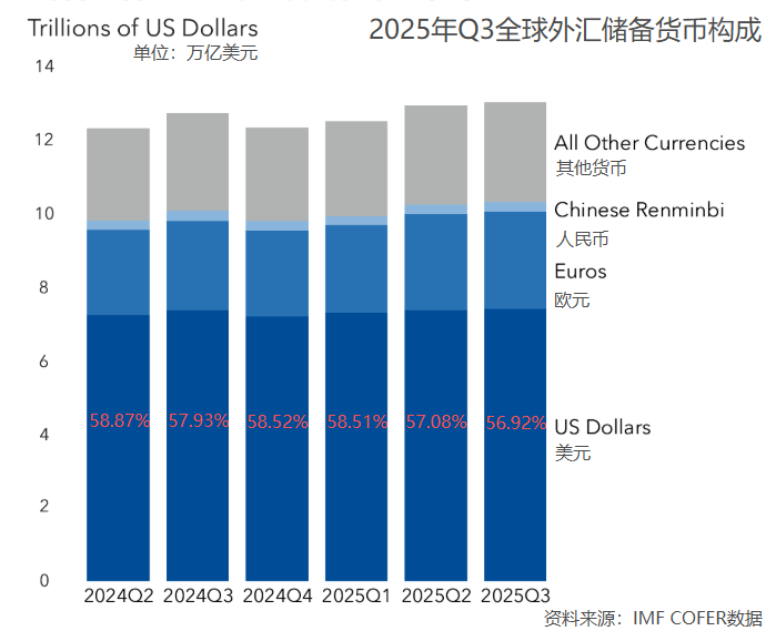国际货币基金组织(IMF)汇总的官方外汇储备货币构成(COFER)数据显示,截至2025年第三季度,全球外汇储备总额为13万亿美元,其中美元的占比为56.92%,较前一季度的57.08%小幅下滑。