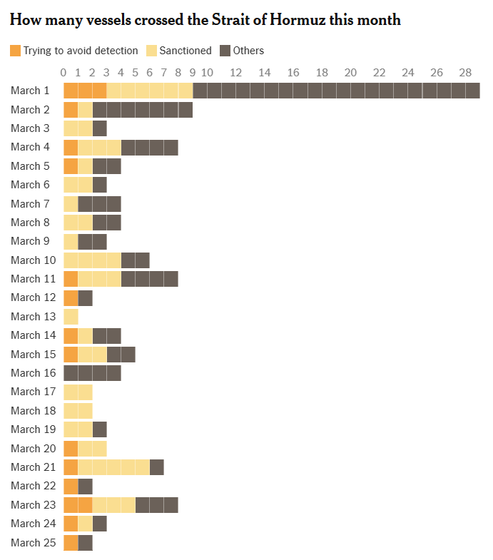2026年3月通过霍尔木兹海峡的船只数量:橙色为试图规避侦测的船只,黄色为受制裁船只,黑色为其他船只