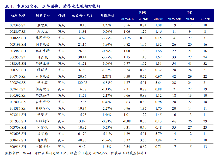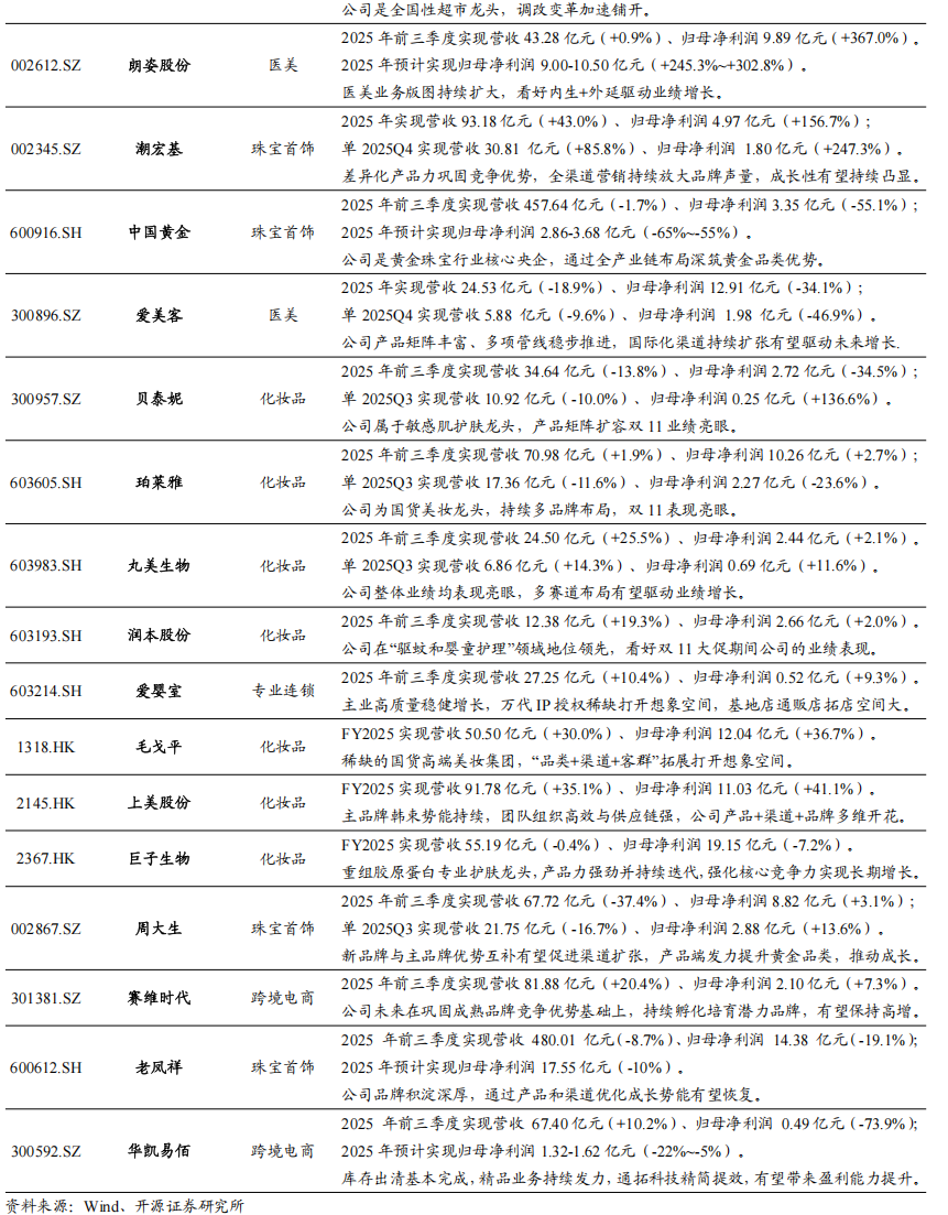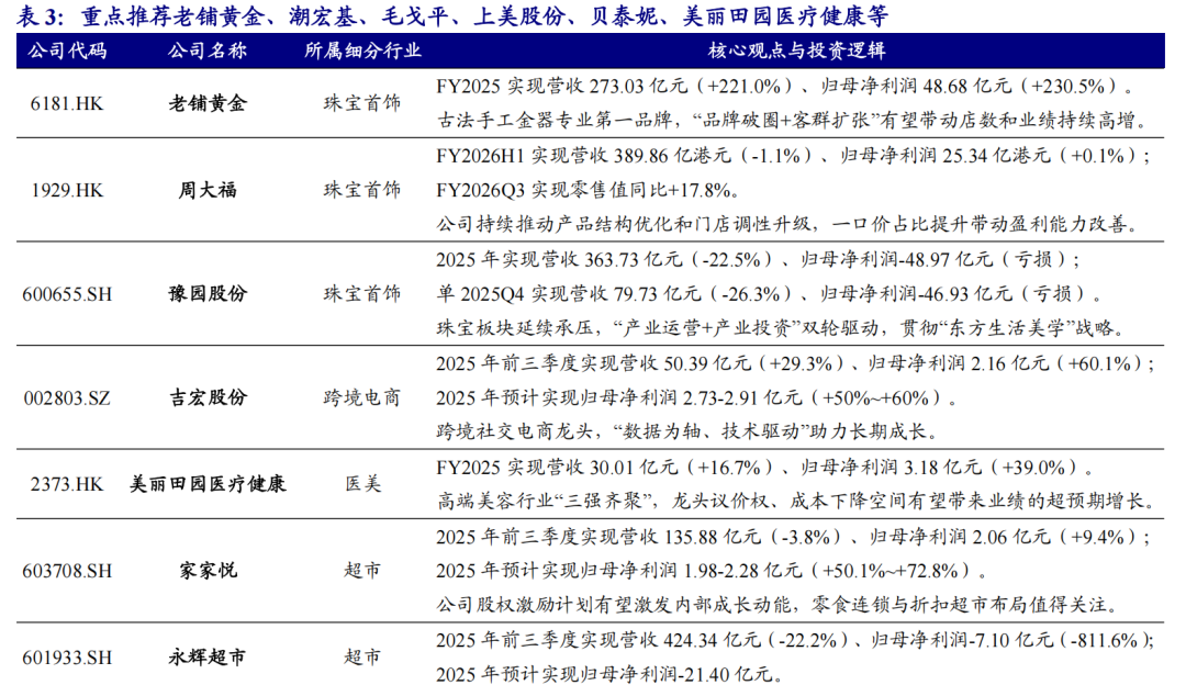 上市公司陆续披露2025年报,我们选取各板块代表性上市公司进行梳理分析。(1)黄金珠宝:行业延续高端化和时尚化趋势,其中老铺黄金年报业绩亮眼,一季度预告高增长,品牌高端定位持续验证,国内门店优化及出海推动业绩持续增长;潮宏基加盟业务迅速发展,差异化产品力巩固竞争优势,全渠道营销放大品牌声量,出海拓展加速。(2)化妆品:国货崛起旋律不变,2025年化妆品品牌整体表现较亮眼,毛戈平归母净利润同比+36.8%,彩妆护肤香氛协同发展,高端渠道稳步深化,海外布局打开新空间,上美股份归母净利润同比+41.1%,主品牌韩束稳健增长并强化多品类布局,Newpage一页快速放量,新品牌持续孵化。(3)医美:2025年终端美容机构美丽田园医疗健康整合能力成效显著,资生堂合作推动品牌升级,爱美客等差异化上游厂商陆续有新品推出带动业绩。从已发布业绩的公司情况看,各消费板块公司业绩呈分化态势。具体看,高端国货消费品牌如老铺黄金、毛戈平等呈现更高景气,而部分抓住渠道变化机会、具备差异化产品力的品牌如潮宏基、上美股份等亦业绩亮眼,此外,上海家化、科笛等公司经营态势也出现明显改善。
