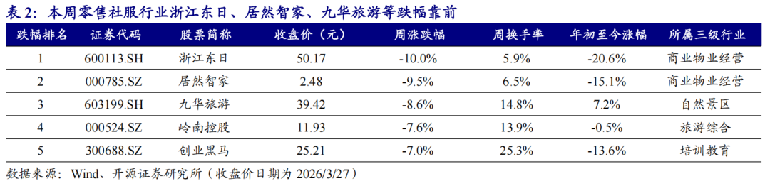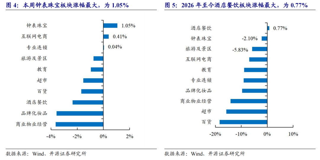 零售社服各细分板块中,钟表珠宝板块本周涨幅最大;2026年年初至今,酒店餐饮板块涨幅最大。在零售社服行业各主要细分板块(我们依据二级行业分类,选择较有代表性的超市、互联网电商、教育、专业连锁、百货、品牌化妆品、酒店餐饮、商业物业经营、钟表珠宝和旅游及景区10个细分板块)中,本周3个子板块上涨,其中钟表珠宝板块涨幅最大,周涨幅为1.05%;2026年全年来看,酒店餐饮板块年初至今累计涨幅为0.77%,在各细分板块中领跑。