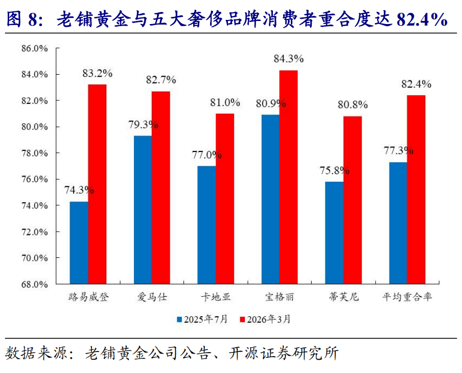 产品迭代推新、渠道优化升级、品牌高端定位持续验证。产品端:公司重视产品研发创新和升级,持续推出具备竞争力的新品,截至2025年底已创作超2300项原创设计作品。渠道端:2025年公司线上业务实现收入46.57亿元,同比增长341.3%,意味着随着品牌影响力的扩大,除一线城市以外的消费人群也在快速扩大;线下方面,截至2025年底公司门店总数45家(新增10家、优化扩容9家)、入驻高端商场34个,2025年在全球奢侈品集团中,公司在中国内地单商场店效、坪效均排名第一,同店收入同比增长160.6%。品牌端:老铺黄金品牌影响力持续扩大,根据胡润研究院《胡润至尚优品-中国高净值人群品牌倾向报告》,2026年老铺黄金进入中国高净值人群最受青睐珠宝品牌榜单前三名,刷新中国品牌纪录。此外,据弗若斯特沙利文数据,老铺黄金与路易威登等五大奢侈品牌消费者重合率从2025年7月的77.3%提升至2026年3月的82.4%,高端定位持续验证。