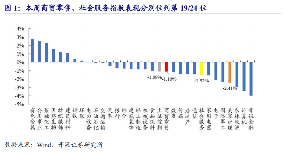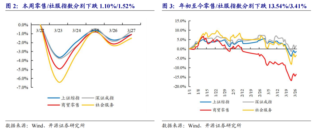 本周(3月23日-3月27日)A股下跌,商贸零售和社会服务指数分别下跌1.10%/下跌1.52%。本周上证综指报收3913.72点,周累计下跌1.09%;深证成指报收13760.37点,周下跌0.76%;本周全部31个一级行业中,表现排名前三位的分别为有色金属、公用事业和基础化工。具体看,商贸零售和社会服务指数本周分别报收2094.67点/8465.81点,分别下跌1.10%/下跌1.52%,在所有一级行业中分别位列第19/24位。2026年年初至今,上证综指累计下跌1.39%,商贸零售指数累计下跌13.54%,社会服务指数累计下跌3.41%。