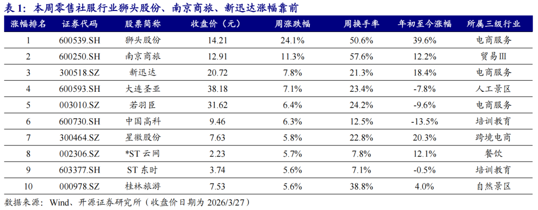 本周(3月23日-3月27日),商贸零售和社会服务指数分别报收2094.67点/8465.81点,分别下跌1.10%/下跌1.52%(同期上证综指累计下跌1.09%),在31个一级行业中分别位居第19/24位。商社各细分板块中,本周钟表珠宝板块涨幅最大,2026年年初至今酒店餐饮板块领跑。个股方面,本周狮头股份(+24.1%)、南京商旅(+11.3%)、新迅达(+7.8%)涨幅靠前。