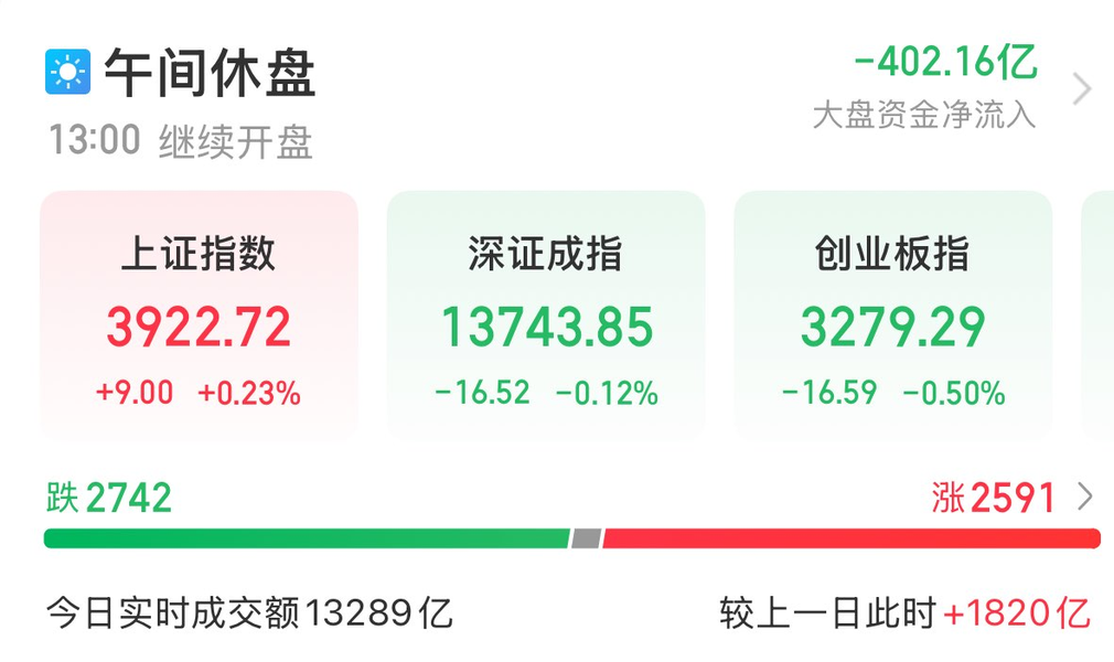 截至午盘,上证指数涨0.23%,深证成指跌0.12%,创业板指跌0.5%,北证50跌0.3%。全市场成交额13269亿元,较上日成交额放量1801亿元。