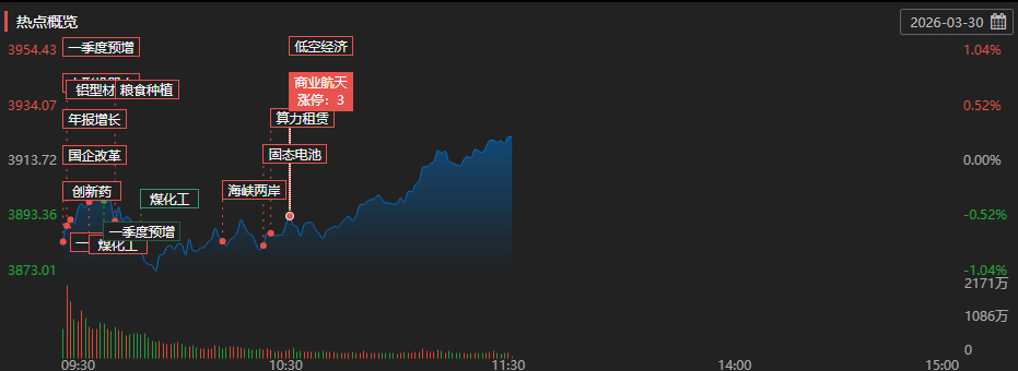 盘面上,贵金属板块持续走强,赤峰黄金(600988)涨近7%,山东黄金(600547)、山金国际(000975)、招金黄金(000506)、中金黄金(600489)跟涨。农业板块开盘走强,北大荒(600598)涨停,苏垦农发(601952)涨超7%。创新药板块部分活跃,海特生物(300683)、三生国健涨超10%,双鹭药业(002038)、联环药业(600513)涨停封板。电力板块持续走弱,晋控电力(000767)、华电辽能(600396)、宁波能源(600982)跌停。光伏设备走弱,迈为股份(300751)跌超15%。油气板块高开低走,首华燃气(300483)、新天然气(603393)跌超5%。