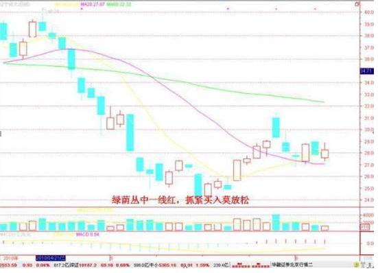 炒股口诀八:绿荫丛中一线红,抓紧买入莫放松。
