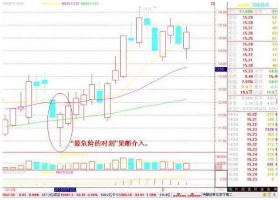 下跌形态大体上可分两种,一种是下跌趋缓型,另一种是下跌加速型。本诀的意思是说在一个连续的下跌过程中,从日K线看,下跌的幅度呈越来越小型,那它反弹的时候一般开始的比较慢,你完全有时间去跟进,但如果从日K线看,那种跌幅越来越大的走势,它反弹的时候则是突然间就开始的,速度快且幅度大,你必须快速反应才能追进去,否则,当你发现的时候就已经是底部起来的一棵带长下影的大阳线了,进晚了利润空间就不大了。口诀十一,主要是针对下跌趋缓型走法的,那么对于下跌加速型走势,如果等到K线翻红时进就有点晚了,因此,就要“相时而动”,就是自己要凭感觉来把握最佳时机了。一般是在“最危险的时刻”果断介入。