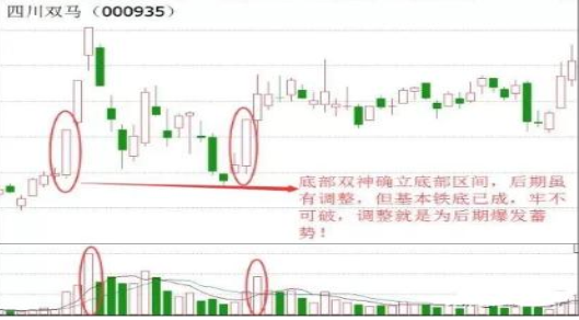 底部双神K线组合形态是指股价在低点出现一根大阳线,俗称“打底”,然后在反弹的过程中再次遇到压力位而选择回落,不过就在大家以为再次会下跌时,又出现了大阳线,这个时候形态和第一根几乎是一样的,我们就把它称之为“底部双神”形态。这个形态的第一根阳线是见底信号,第二根阳线则是启动入场的信号,这两根阳线相距不宜超三个月,而且当阳线出现的同时必须放量。