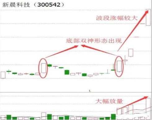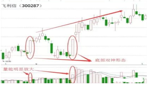 底部双神形态出现,就意味着短期股价已经探明底部!接下来将会进入到反弹行情,此时在第二根阳线的地方选择介入,短线会有不错的获利机会!