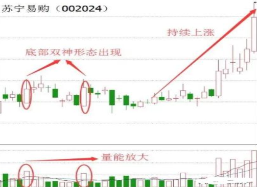 大阳+大阳组合:苏宁易购形成底部双神形态,而后连续上涨,能找到这种形态的走势,同时再叠加风口,赚钱如探囊取物。