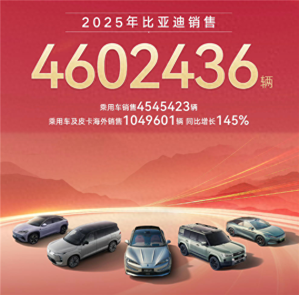 2025年,比亚迪以460.24万辆的销量收官,不仅蝉联全球新能源汽车销量冠军,更登顶中国市场车企销冠、中国品牌销冠,实现“三冠王”封神,彻底巩固了行业龙头地位。
