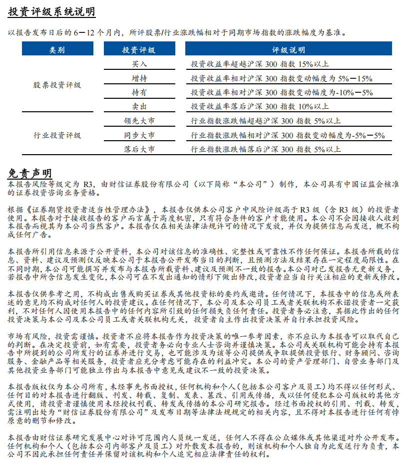 本订阅号不是财信证券研究报告的发布平台,所载内容均来自财信证券已正式发布的研究报告或对报告进行的跟踪与解读,订阅者若使用所载资料,有可能会因缺乏对完整报告的了解而对其中关键假设、评级、目标价等内容产生误解。提请订阅者参阅财信证券已发布的完整证券研究报告,仔细阅读其所附各项声明、信息披露事项及风险提示,关注相关的分析、预测能够成立的关键假设条件,关注投资评级和证券目标价格的预测时间周期,并准确理解投资评级的含义。