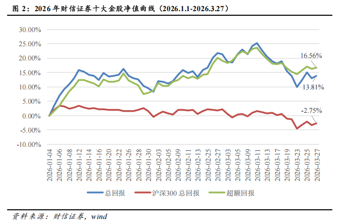 2026年财信证券十大金股组合1-3月累计收益率为13.81%(按照复利计算),跑赢同期沪深300基准指数16.56个百分点。