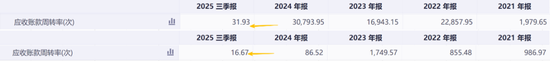 经营活动现金流上,2025年前三季度,酒鬼酒为-3.26亿元,水井坊更是低至-8.67亿元。水井坊除了上述的新项目投入之外,与酒鬼酒的共同困境在于:应收账款周转率大幅下降,回款速度急剧恶化,大量资金被占用在渠道和库存里。