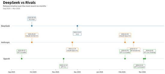DeepSeek vs 对手发布频率时间轴图(2025.9-2026.3)