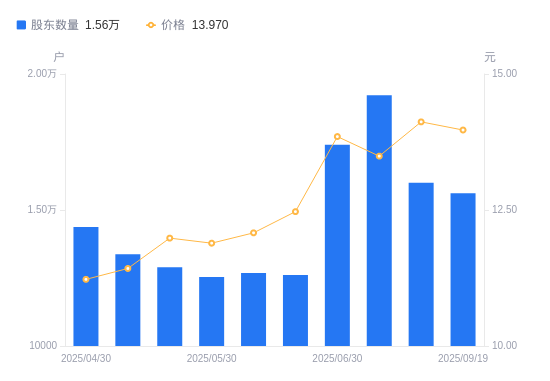 近一年(2024年9月30日至2025年9月19日),海能实业A股股东户数从1.5万户,增加至1.56万户,增幅3.91%,区间股价上涨47.71%。