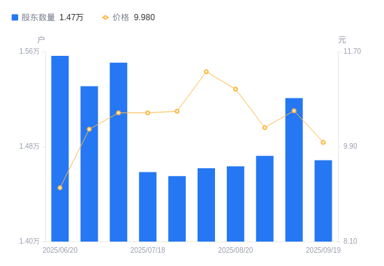 近一年(2024年9月20日至2025年9月19日),春雪食品A股股东户数从1.61万户,减低至1.47万户,降幅8.79%,区间股价上涨31.49%。