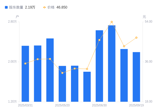 近一年(2024年9月30日至2025年9月19日),中科海讯A股股东户数从1.36万户,增加至2.19万户,增幅60.73%,区间股价上涨177.05%。