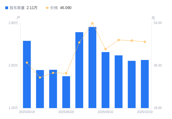 10月17日消息,数据显示,截至2025年10月10日,中科海讯A股股东总户数为2.11万户,较上期(2025年9月30日)增加171户,增幅0.82%。公司最新A股总股本为1.18亿股,其中流通A股1.14亿股,户均持有流通A股数量为5411.63股,较上期减少44.29股,降幅0.81%;户均持流通A股市值24.94万元,较上期减少4714.8元,降幅1.86%。