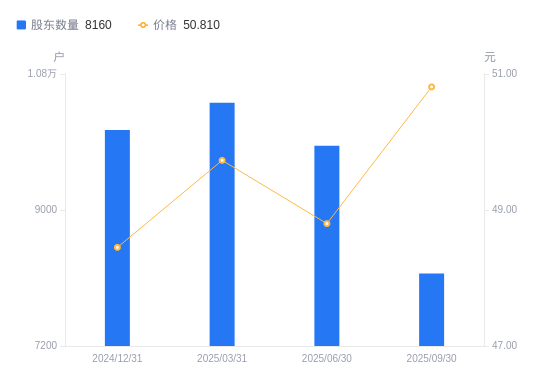 近一年(2024年9月30日至2025年9月30日),国缆检测A股股东户数从9067户,减低至8160户,降幅10.00%,区间股价上涨27.03%。