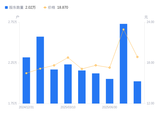 10月27日消息,数据显示,截至2025年9月30日,天元智能A股股东总户数为2.02万户,较上期(2025年8月20日)减少7059户,降幅25.86%。公司最新A股总股本为2.14亿股,其中流通A股5605.84万股,户均持有流通A股数量为2770.51股,较上期增加716.56股,增幅34.89%;户均持流通A股市值5.23万元,较上期增加5202.95元,增幅11.05%。