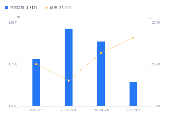 近一年(2024年9月30日至2025年9月30日),易天股份A股股东户数从2.1万户,减低至1.71万户,降幅18.80%,区间股价上涨24.35%。