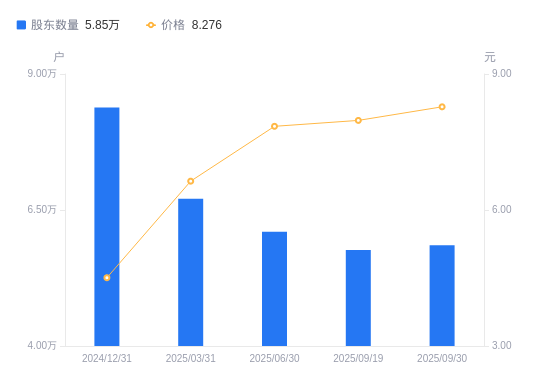 近一年(2024年9月30日至2025年9月30日),*ST华微A股股东户数从9.09万户,减低至5.85万户,降幅35.64%,区间股价上涨144.42%。