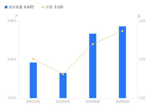 近一年(2024年9月30日至2025年9月30日),华电辽能A股股东户数从5.41万户,增加至6.43万户,增幅18.84%,区间股价上涨24.30%。