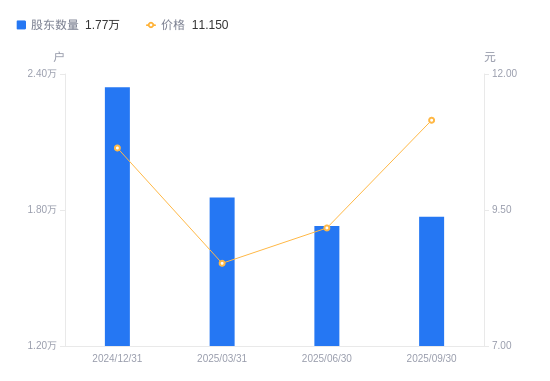 近一年(2024年9月30日至2025年9月30日),和顺电气A股股东户数从1.97万户,减低至1.77万户,降幅10.32%,区间股价上涨32.90%。