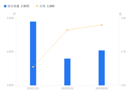 10月28日消息,数据显示,截至2025年9月30日,ST京蓝(维权)A股股东总户数为2.92万户,较上期(2025年6月30日)增加194户,增幅0.67%。公司最新A股总股本为28.57亿股,其中流通A股22.86亿股,户均持有流通A股数量为7.82万股,较上期减少522.22股,降幅0.66%;户均持流通A股市值13.76万元,较上期减少8789.28元,降幅6.00%。