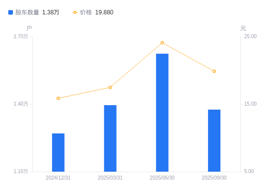 10月28日消息,数据显示,截至2025年9月30日,德必集团A股股东总户数为1.38万户,较上期(2025年6月30日)减少2490户,降幅15.33%。公司最新A股总股本为1.51亿股,其中流通A股1.51亿股,户均持有流通A股数量为1.1万股,较上期增加1683.07股,增幅18.10%;户均持流通A股市值21.83万元,较上期减少5874.47元,降幅2.62%。