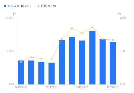 近一年(2024年10月31日至2025年10月20日),北纬科技A股股东户数从4.57万户,增加至10.23万户,增幅123.85%,区间股价上涨60.06%。