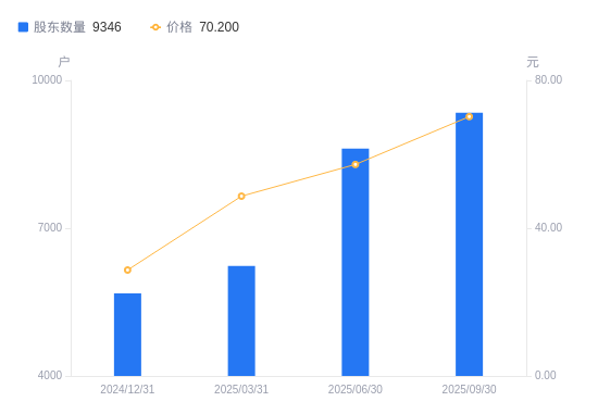 近一年(2024年9月30日至2025年9月30日),金沃股份A股股东户数从3722户,增加至9346户,增幅151.10%,区间股价上涨359.27%。