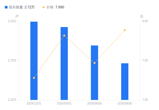 近一年(2024年9月30日至2025年9月30日),鼎汉技术A股股东户数从3.39万户,减低至2.72万户,降幅19.94%,区间股价上涨13.53%。