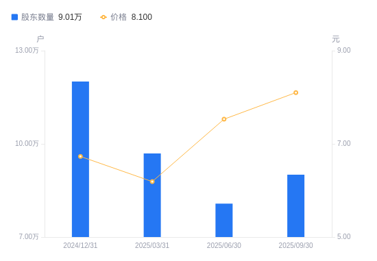 近一年(2024年9月30日至2025年9月30日),华东重机A股股东户数从6万户,增加至9.01万户,增幅50.18%,区间股价上涨130.77%。