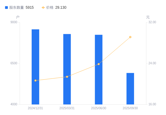 10月29日消息,数据显示,截至2025年9月30日,美硕科技A股股东总户数为5915户,较上期(2025年6月30日)减少2326户,降幅28.22%。公司最新A股总股本为1.01亿股,其中流通A股2940万股,户均持有流通A股数量为4970.41股,较上期增加1402.89股,增幅39.32%;户均持流通A股市值14.48万元,较上期增加5.97万元,增幅70.10%。