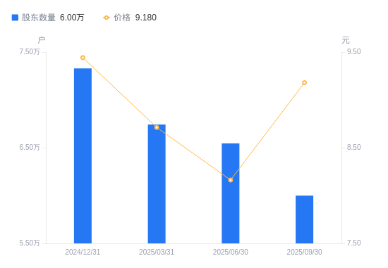 近一年(2024年9月30日至2025年9月30日),龙头股份A股股东户数从8.14万户,减低至6万户,降幅26.31%,区间股价上涨13.17%。