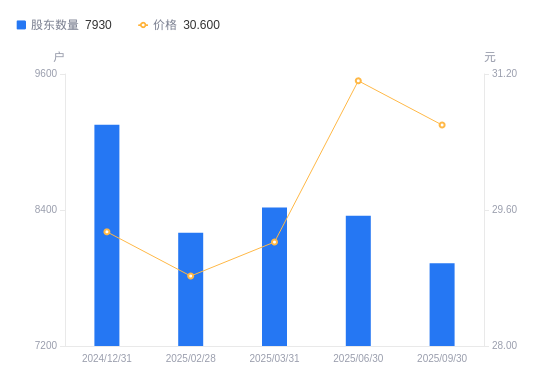 近一年(2024年9月30日至2025年9月30日),中公高科A股股东户数从1.13万户,减低至7930户,降幅29.89%,区间股价上涨11.95%。